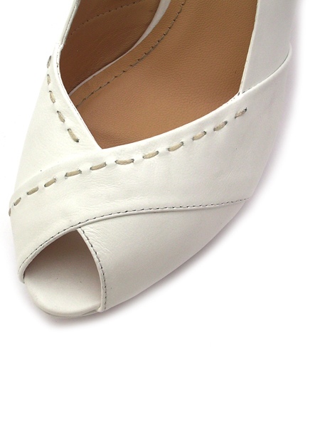 Стильные туфли молочного цвета на высоком каблуке. Мыс открытый, спереди декорированы отстрочкой в тон. Каблук имитирован под дерево, что оттеняет и подчеркивает белизну туфель. Отличный вариант для торжественных мероприятий - например, выпускной, свадьба.