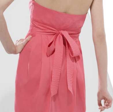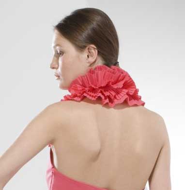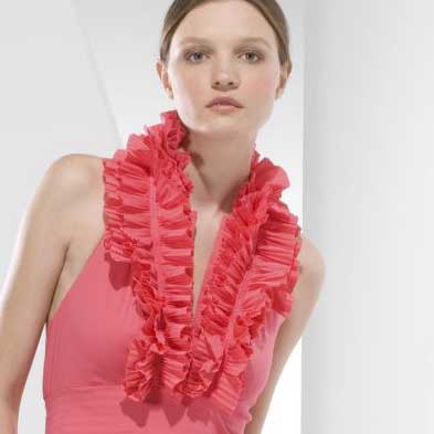 V-образный глубокий вырез горловины платья обрамлен пышными рюшами.