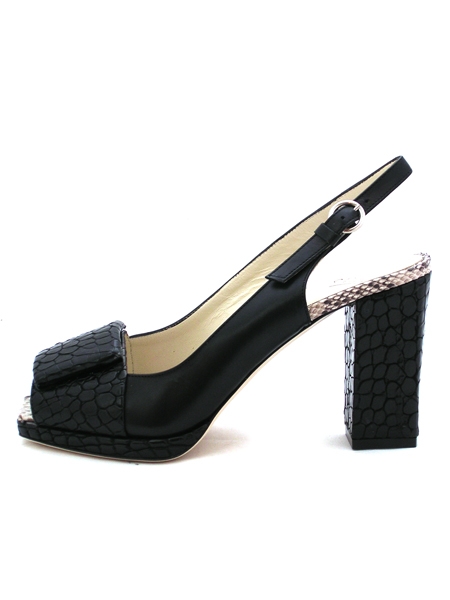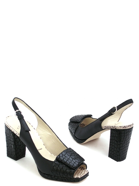 Женственные и модные босоножки выполнены в стиле70-х - квадратный и открытый мыс, каблук массивный и устойчивый. Вставки с имитацией под крокодила добавляют модели современный шик.