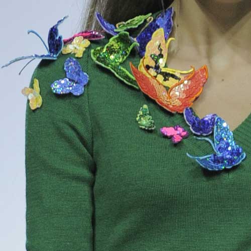 Платье декорировано множеством бабочек, расшитых разноцветными пайетками.