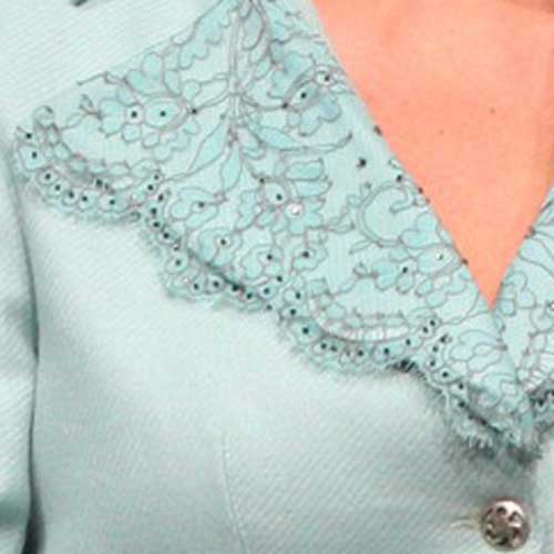 Лацканы украшены тонким французским кружевом и расшиты стеклярусом.