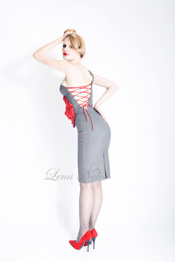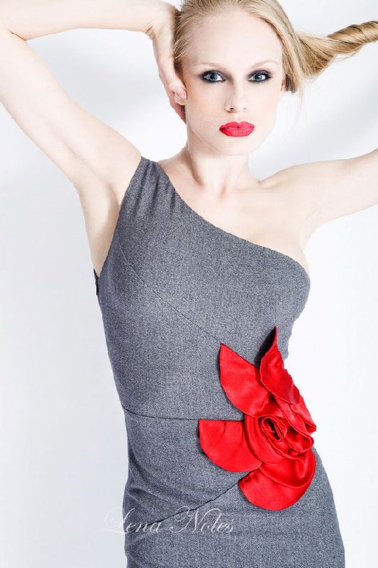 Платье декорировано крупной розой алого цвета из натурального шелка.