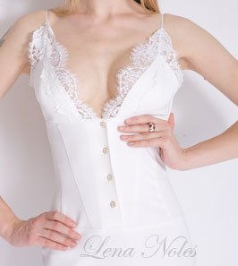 Лиф платья застегивается на ряд круглых пуговок со стразами Swarovski.