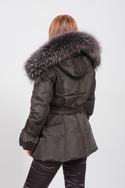 Цвет глубокий черный, с шелковым отливом. Мех енот окраса "чернобурка". Рукава и спинка с жатыми вставками, низ рукавов украшен модными фонариками.
