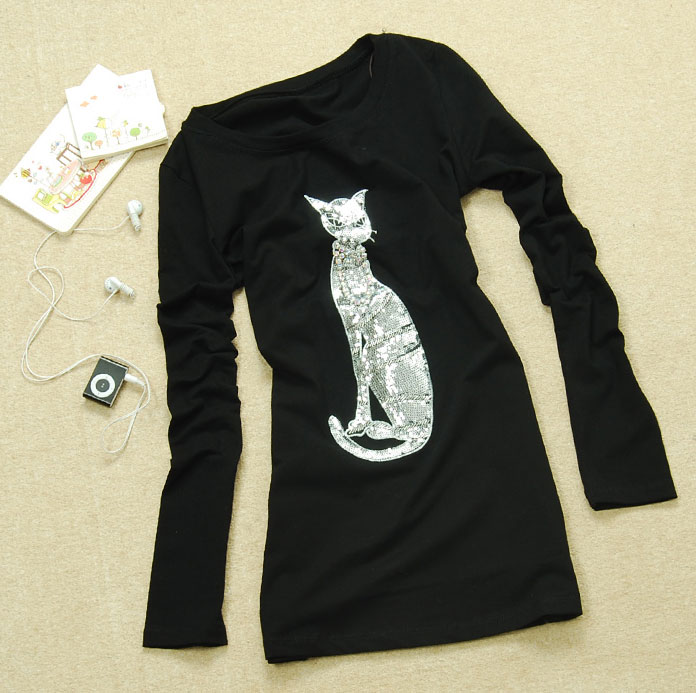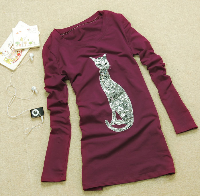 Удобная футболка с длинным рукавом - необходимая вещь в женском гардеробе. "Кошечка" расшита маленькими серебристыми пайетками и бусинками. Эта модель для тех, кому необходимо одеться быстро и эффектно. Однотонный наряд смотрится нескучно благодаря оригинальной аппликации в виде кошечки. Изделие выполнено в трёх разных цветовых вариациях, поэтому каждая модница сможет подобрать футболку на свой вкус.