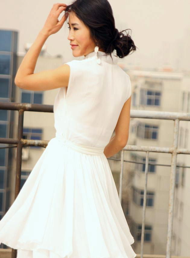 Лёгкое, как пёрышко, почти невесомое, это летнее платье будто предназначено для ангельского создания. Белоснежная пена оборок, облако многослойного шифона, подхваченное поясом по линии талии, аккуратный V-образный вырез и небольшой воротничок-стойка собраны в единый ансамбль, призванный создать нежный романтичный образ.