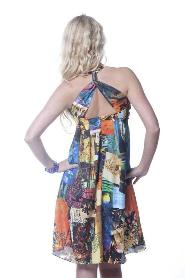 Удачный крой, комфортная посадка по фигуре, лёгкие драпировки и приятная на ощупь ткань сочетаются неповторимым ансамблем в этой колоритной модели. Бретели, закреплённые на спинке декоративным элементом - ещё одна замысловатая деталь, делающая модель такой необычной.