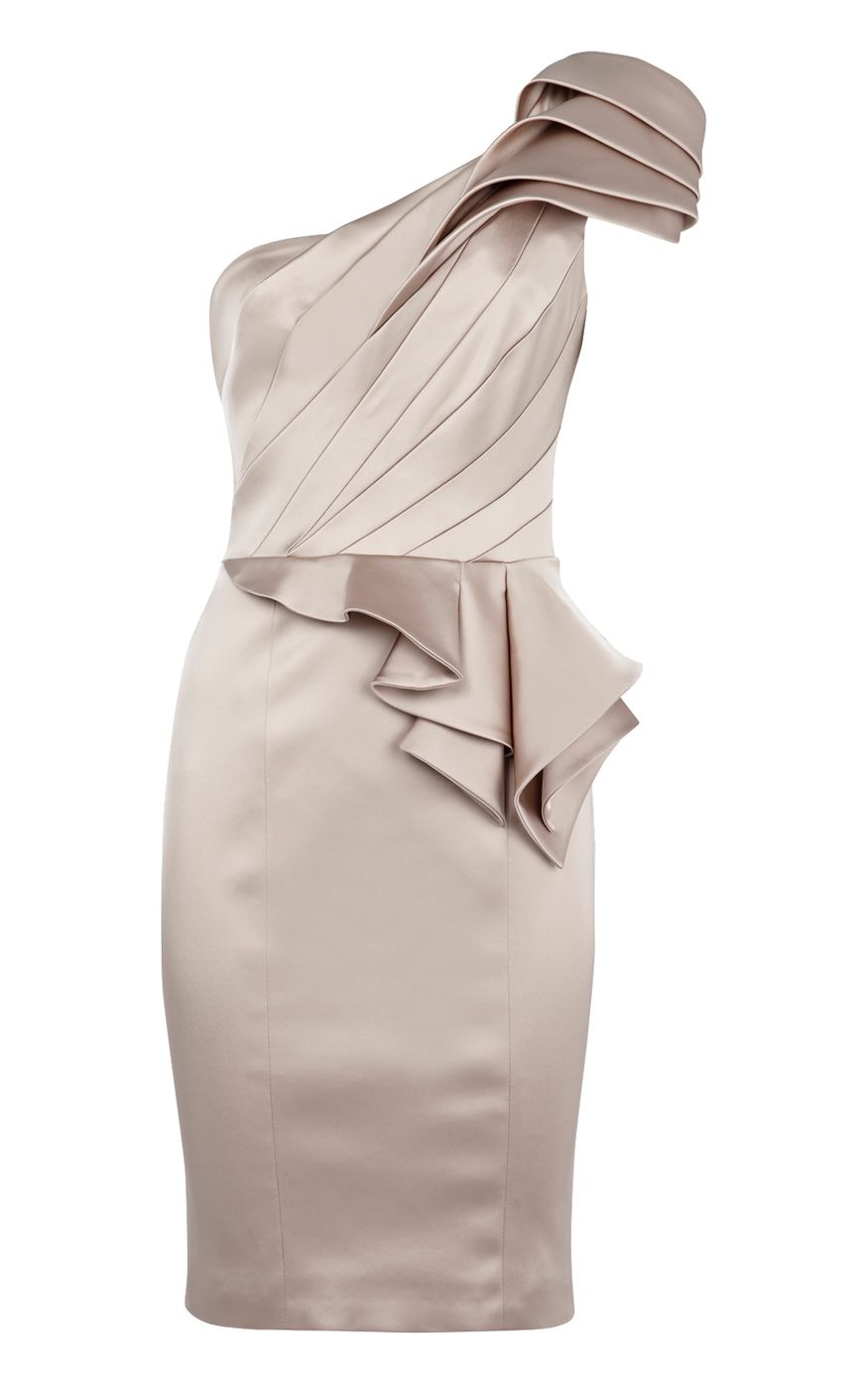 Мягкий матовый блеск атласа, сложнокроенный лиф, переходящий в бретель с плечом-цветком, кокетливый волан по линии талии и превосходная посадка по фигуре делают эту модель достойной королевы!