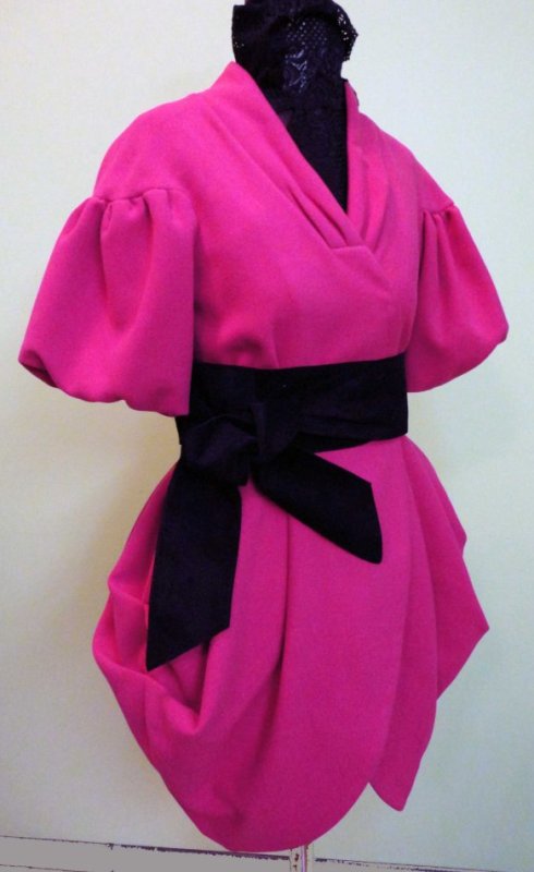 Ярко-розове и необыкновенно красивое пальто выполнено из нежного кашемира. Округлые края подола и короткие рукава-фонарики придают этой вещи женственность и элегантность. Чёрный контрастный широкий пояс из замши, украшенный крупным бантом, помогает создать ощущение стройности.