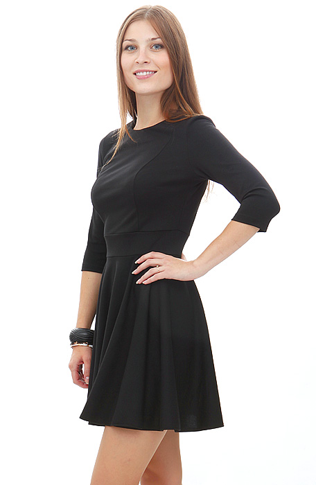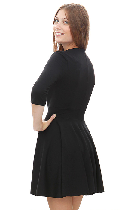 Рукава – три четверти, вырез горловины – лодочка. По линии талии имеется отрезной пояс, который визуально придаёт обладательнице наряда стройности. Фасон юбки – солнце, достаточно моден в этом сезоне. Благодаря множественным складкам, которые выглядят весело и игриво, вы всегда будете в хорошем настроении. Платье можно надеть как под балетки, так и под босоножки на каблучке. Юбка свободная, не сковывает движений. В этом платье вы всегда будете в центре внимания!