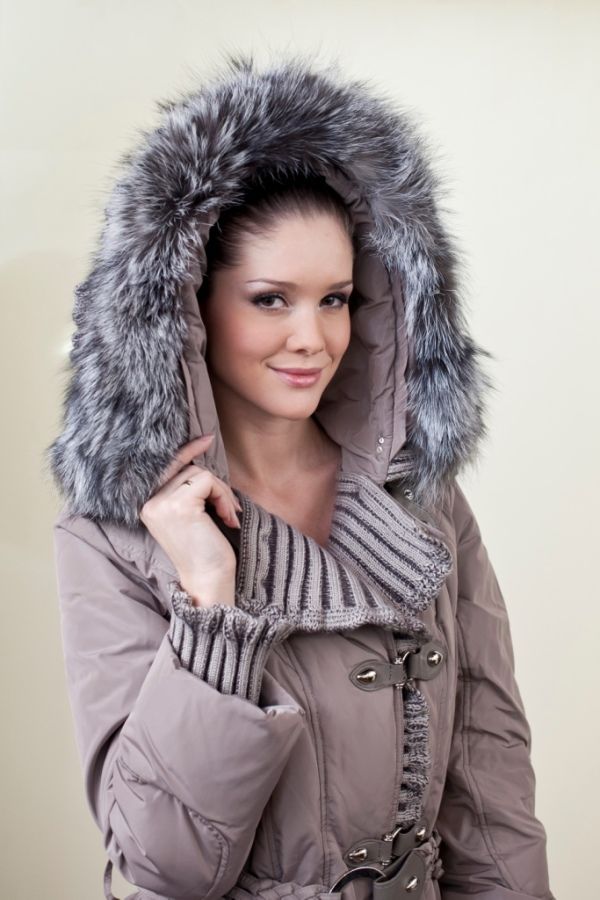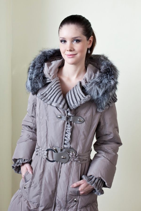 Тёплая, нарядная куртка-пуховик с трикотажным оформлением и капюшоном со съёмным натуральным мехом способна стать любимой вещью в Вашем зимнем гардеробе.