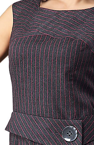 Изящное платье приталенного силуэта с особым темпераментом и деловитостью в стиле. Эта модель буквально вся состоит из ярких идей в крое, эффектность которому создают изящная отрезная кокетка, которая подчеркивает линию груди, оригинальный пояс с декоративной пуговицей, а также сам рисунок в тончайшую полоску розового цвета, которая придает особую утонченность темно-синему фону. Деловой обед, торжественный прием… любой Ваш выход в этом костюме не останется незамеченным.