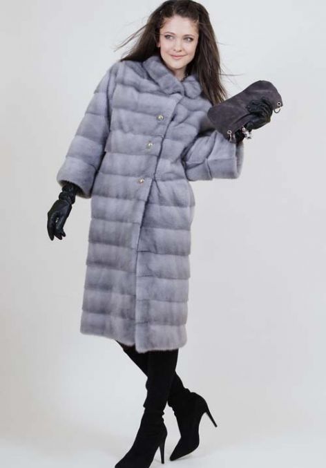Эта модель представлена в новом дизайнерском цвете SAPPHIRE– это очень нежный светло-серый  оттенок со слегка заметным синим отсветом. Великолепный фасон, слегка зауженный книзу с приспущенным плечом. Изюминкой этой шубы является высокая, ассиметричная стойка-лодочка и ассиметричный запах с застежкой на крючки. Шуба потрясающе смотрится как с поясом, так и без него. Для пошива использовался только мех самочек, так как он очень мягкий, приятный на ощупь и очень легкий. Длина изделия 105 см.