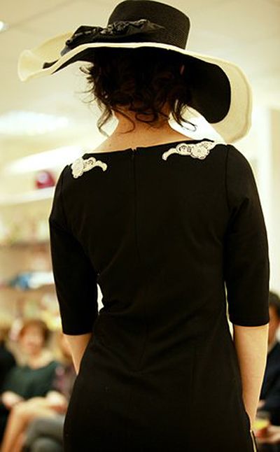 Элегантное знаменитое "маленькое черное платье" с отделкой итальяским кружевом, которое создает пикантный фантазийный мотив у выреза горловины. Белоснежный кружевной узор составляет пикантный контраст черному цвету модели. Платье выполнено в грациозном приталенном фасоне, длина рукава в 3/4. Элегантная модель для истинной леди.