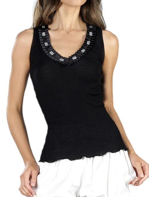 Новинка коллекции итальянского бренда Bona Dea - топ, выполненный в обтягивающем силуэте, который изящно подчеркивает грацию фигуры. Модель отличается выразительным и изящным декором выреза горловины, обработка низа модели образует легкие пикантные волны, струящиеся по всему обему топа.