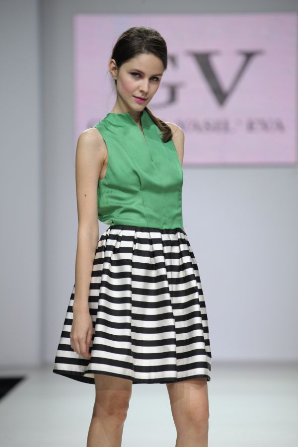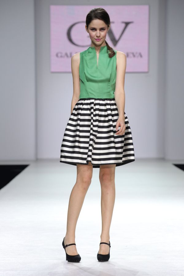 Лиф платья однотонный, без рукавов, отделка горловины напоминает воротник-стойку. Юбка выполнена из эксклюзивной ткани "Унгаро" в эффектную черно-белую полоску. Покрой юбки широкий, с большими мягкими складками, что придает фигуре дополнительную женственность. Актуальная миди длина позволяет использовать данный наряд практически в любых ситуациях.
