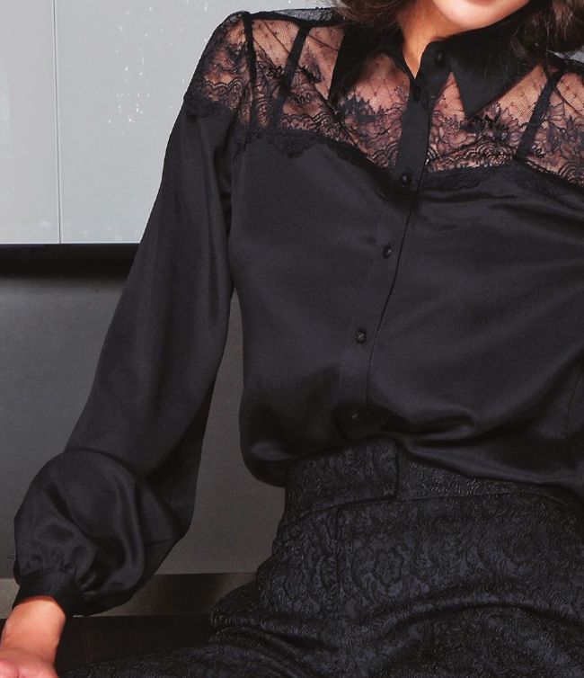 Эксклюзивная модель из новой коллекции итальянского брэнда Dino Chizari - изящная блуза из черного крепдешина, очарование и яркий шарм которой придает исполнение кокетки из роскошного кружева, а также эффектные широкие рукава, изящно присборенные у манжет. Элегантная и выразительная модель составит неповторимый ансамбль в деловом костюме, придаст особый шарм костюму для торжества.