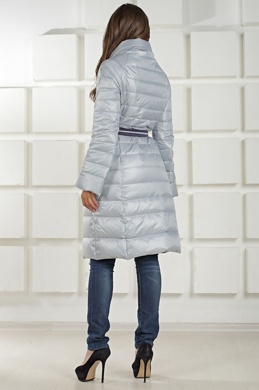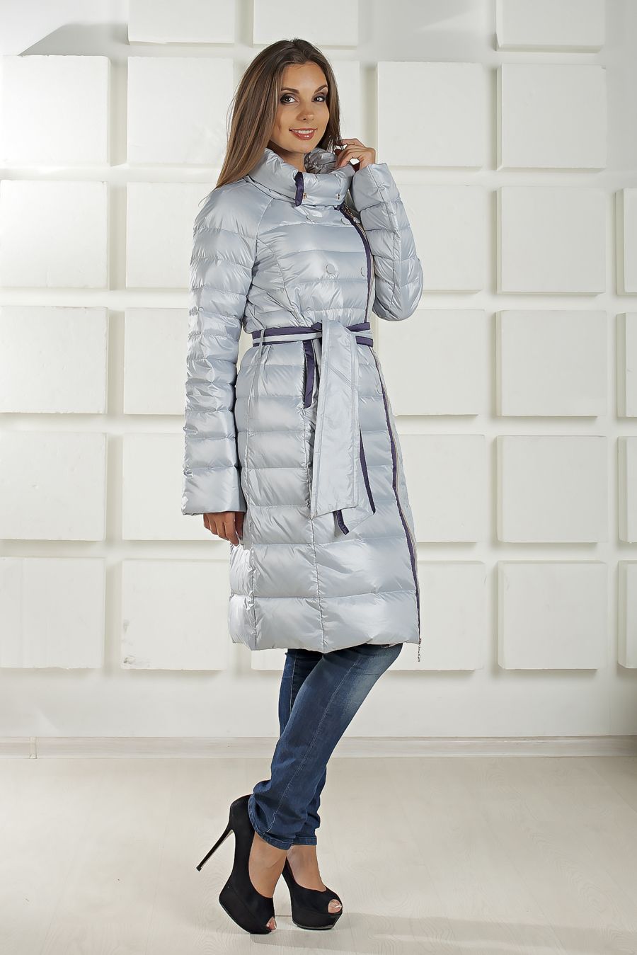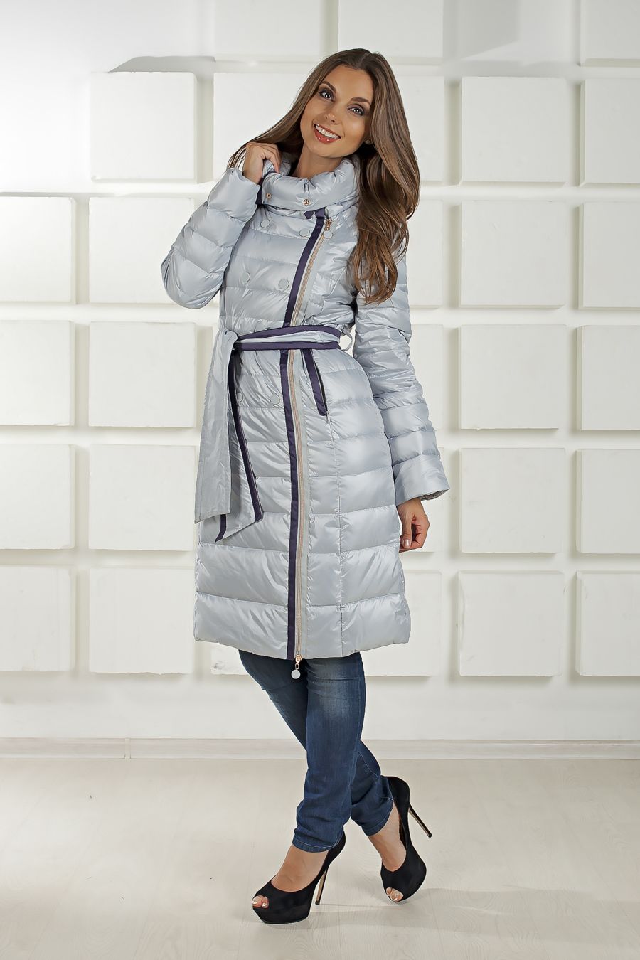 Очень легкий двубортный пуховик нежно-голубого цвета.