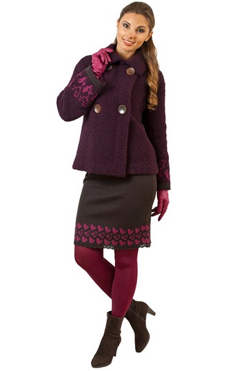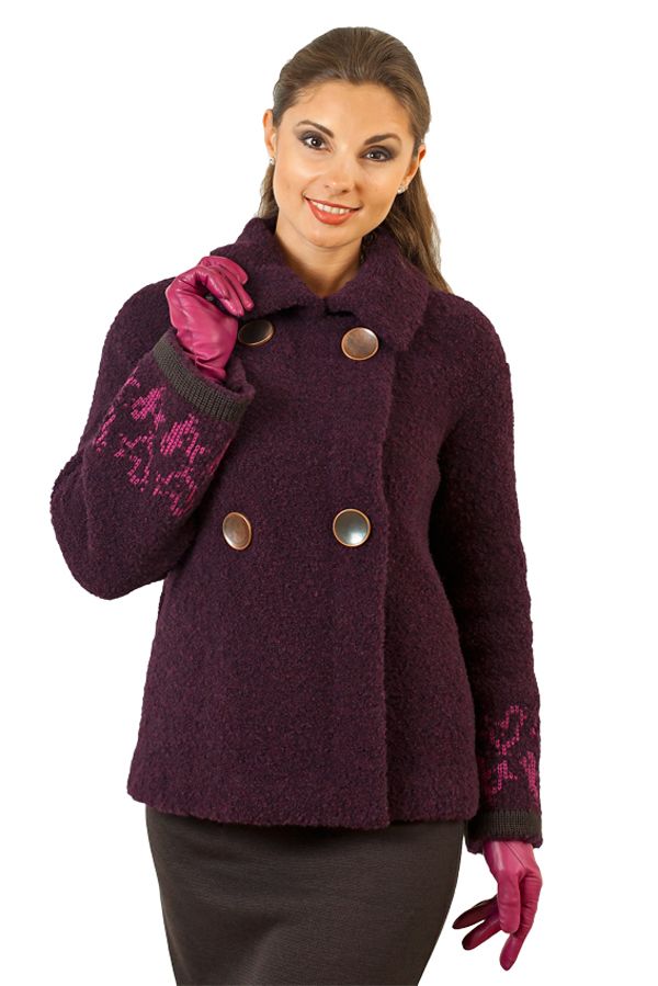 Эффектная модная куртка цвета спелой сливы - модель из новой коллекции модного Дома STOFF. Мягкая куртка выполнена из высококачественной итальянской пряжи с эффектом "букле". Особый шарм укороченной, чуть расклешенной к низу модели придают крупные пуговицы в два ряда, а также оригинальный жаккардовый орнамент "птицы", создающий декор по низу рукавов. Модель, помимо эффектного сливового цвета, также представлена в красном, верблюжьем и чёрном цветах.