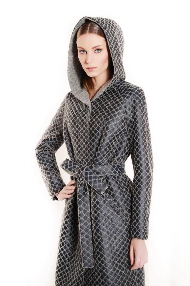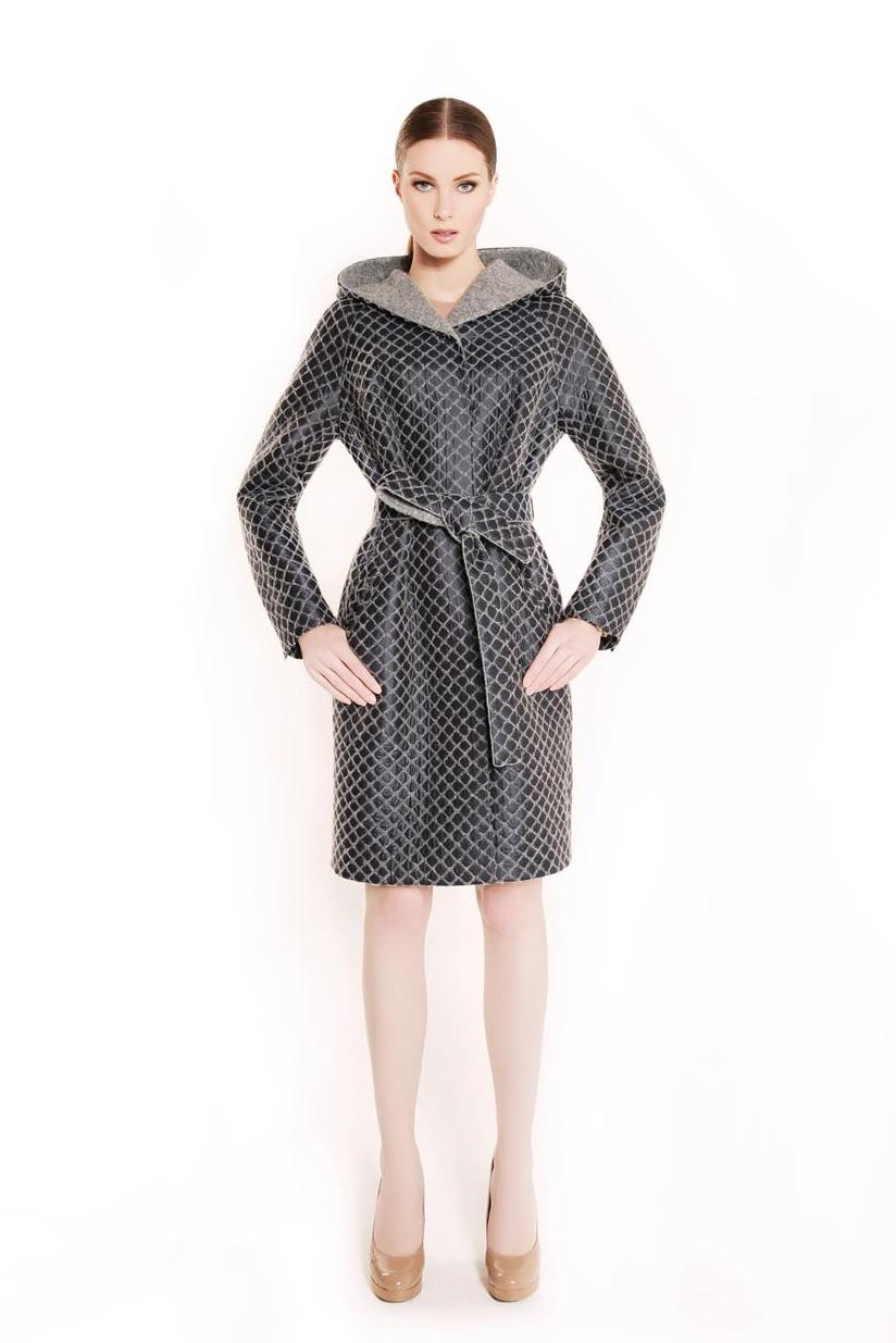 Пальто из двухсотронеей ткани с поясом и капюшоном.