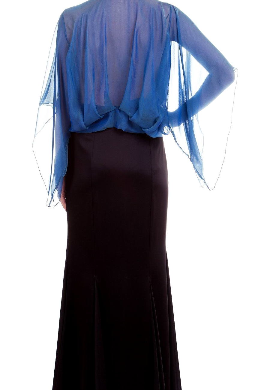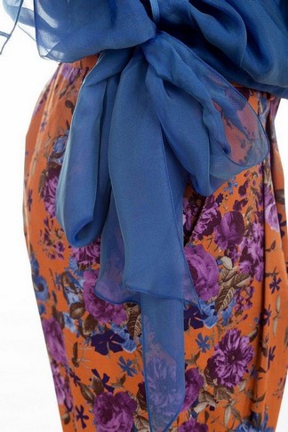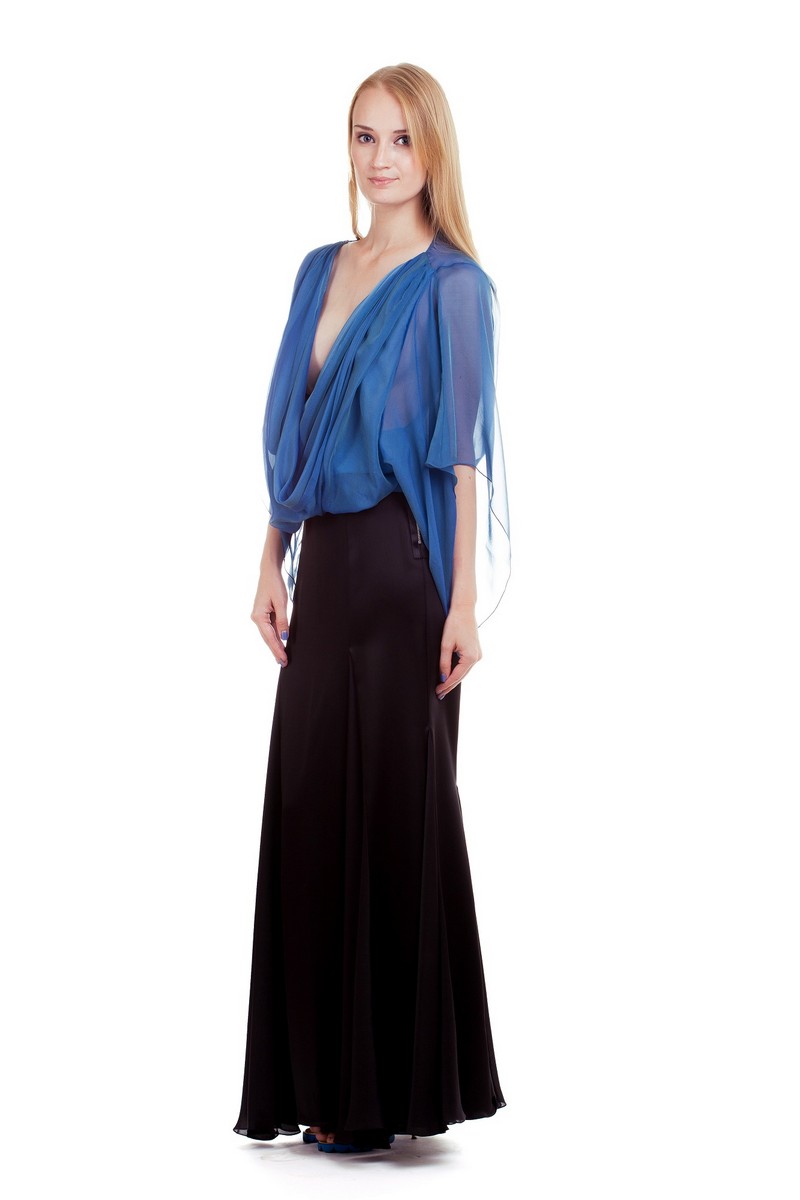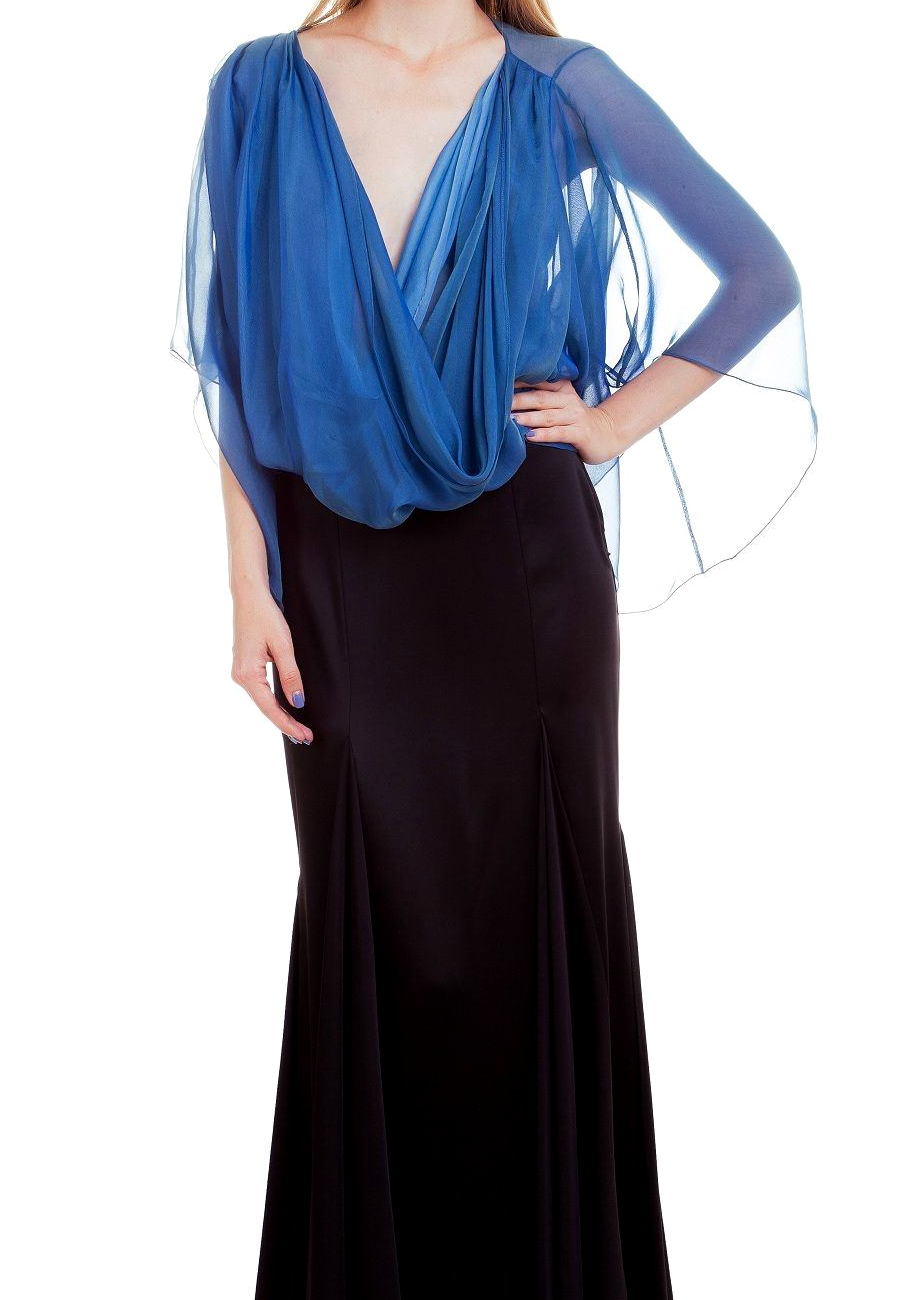 Модель с рукавами-кимоно и многочисленными драпировками по переду и спинке. Оригинальный крой блузы - "качели" сексуально обнажает спину. Блуза фиксируется на бедрах широким манжетом-бантом. Ручная отелка швов и сочетание 2х видов шифона делают эту блузу поистине эксклюзивной.