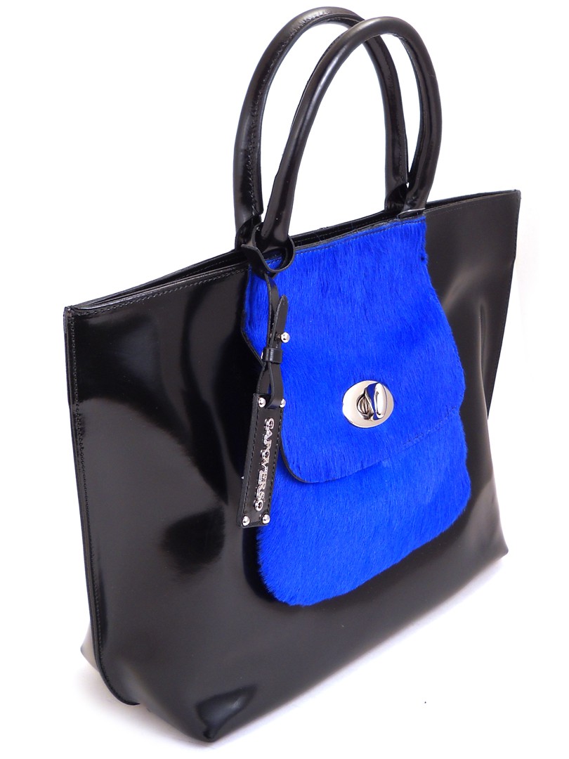 Черная сумка из натуральной кожи с ярко-синим мехом пони. Сумка жесткой формы, кожа шлифованная с небольшим глянцем.