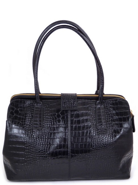 Черная деловая сумка-портфель из фактурной кожи под крокодила. Сумка вмешает документы формата А4. 2 боковых отделния на молнии, перекидной клапан на защелке.