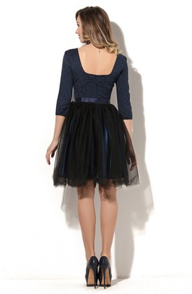 Юбка платья выполнена из двух материалов. Нижний материал – атлас в тон лифа платья, а верхний материал-двухслойный фатин черного цвета.