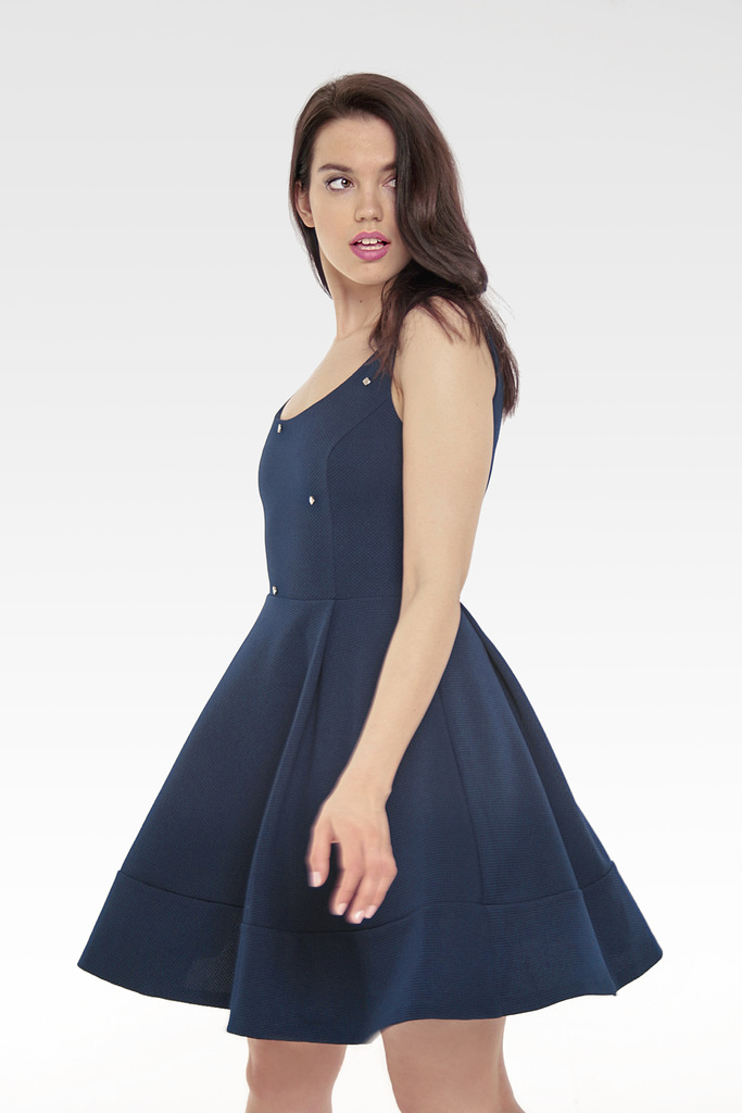 Очаровательное короткое платье насыщенного глубокого синего цвета на широких бретелях с отрезной юбкой- солнцем и эффектными складками- защипами. Металлические бусины в форме ромба – привлекательная деталь декора, позволяющая обойтись без дополнительных украшений.
