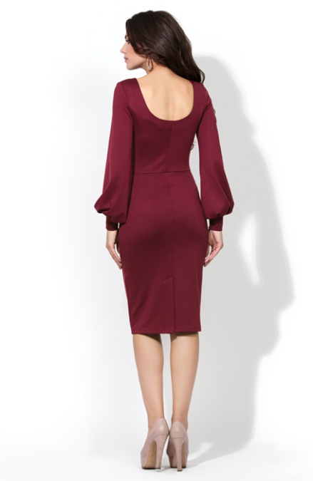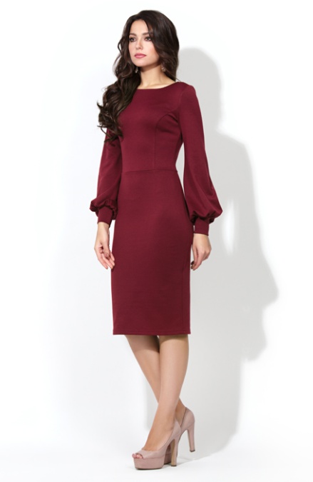 Элегантное платье прилегающего силуэта из плотного трикотажа «джерси». Платье отрезное по линии талии. Идеальную посадку лифа обеспечивают рельефы на спинке и полочке. На спинке – глубокий круглый вырез, на полочке – элегантная «лодочка». Особую изящность модели придают широкие втачные рукава с манжетой. В среднем шве спинки шлица.