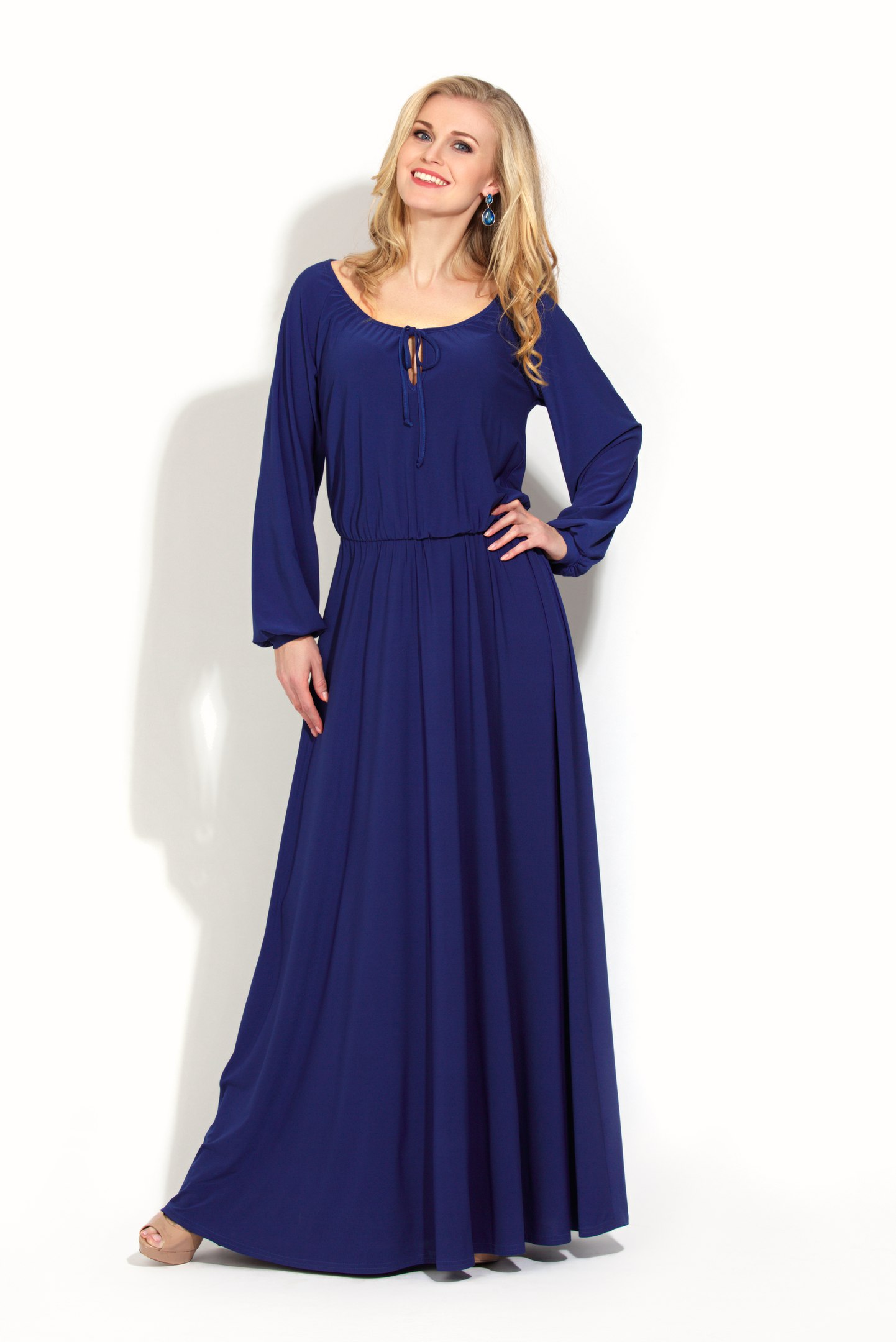 Яркое, красивое, длинное платье с драпировками из тонкого трикотажа черничного цвета. Платье отрезное по линии талии, с обильной сборкой на полочке и на спинке. В шов на линии талии вшита резинка, благодаря которой фиксируется платье. Удлиненный лиф платья образует навал, который можно носить как на талии, так и на бедрах. Горловина платья обработаны узким кантом и завязывается на завязку. Рукав широкий -«реглан», длинный на манжете. Модель стильная и яркая, прекрасно дополнить женский гардероб.