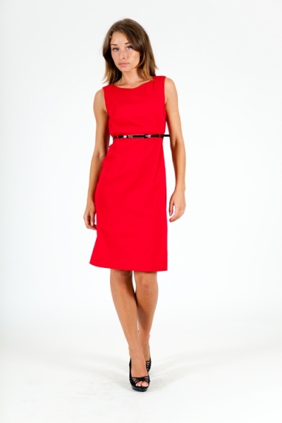 Алое платье в тонкую черную полоску